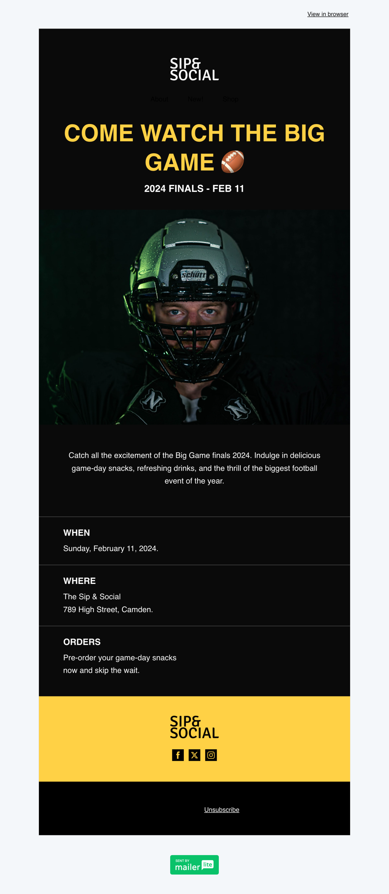 Check out this super bowl football newsletter template. Browse through our newsletter template gallery, get inspired and start creating your own MailerLite newsletter today.