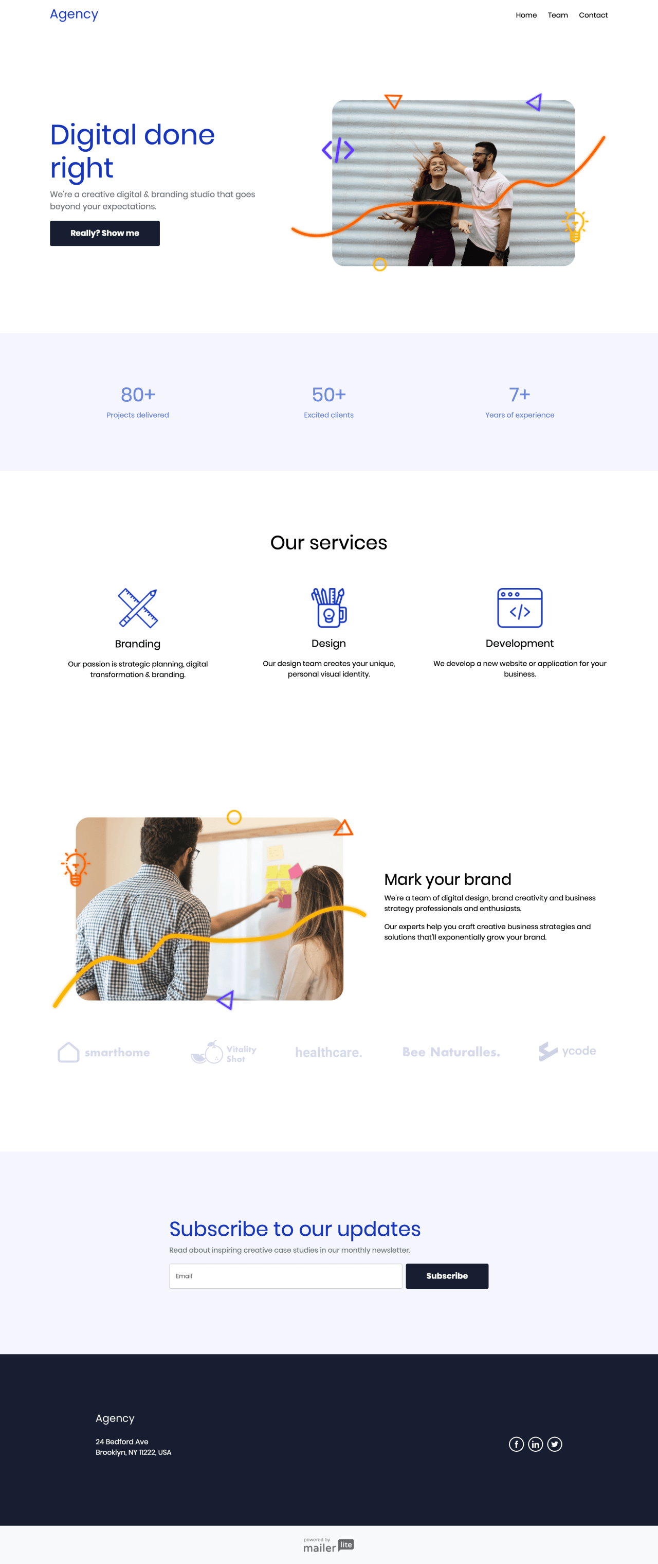 Impress clients with a beautiful website that showcases your agency’s expertise. Our agency website template has service blocks to highlight your offering, and an email sign-up form to generate leads. Add content like testimonials and blog posts, then customize everything with our easy-to-use drag-and-drop website builder. Sign up with MailerLite to create and publish your agency website today.