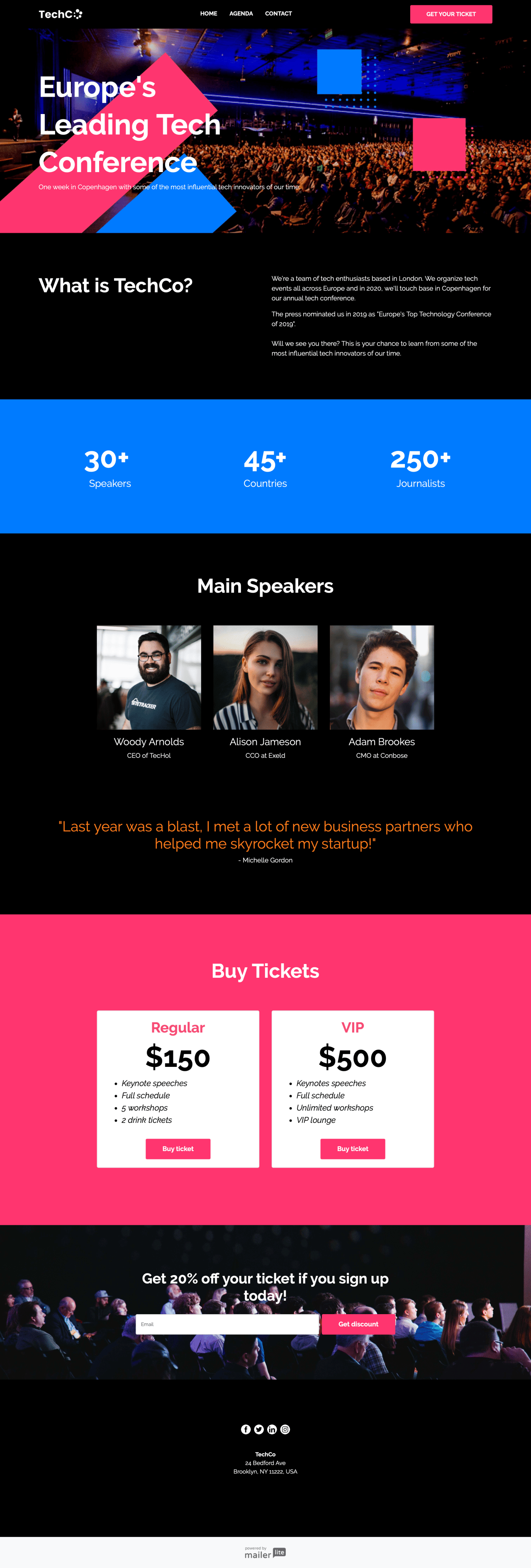 Promote your upcoming event with our event website template. Use the agenda page to provide essential information, and make it easy for people to get in touch with a contact page. Use the inbuilt email sign-up form to collect addresses for your event email marketing. You can even sell tickets on your website with our Stripe integration. Sign up with MailerLite to access our event website template today.