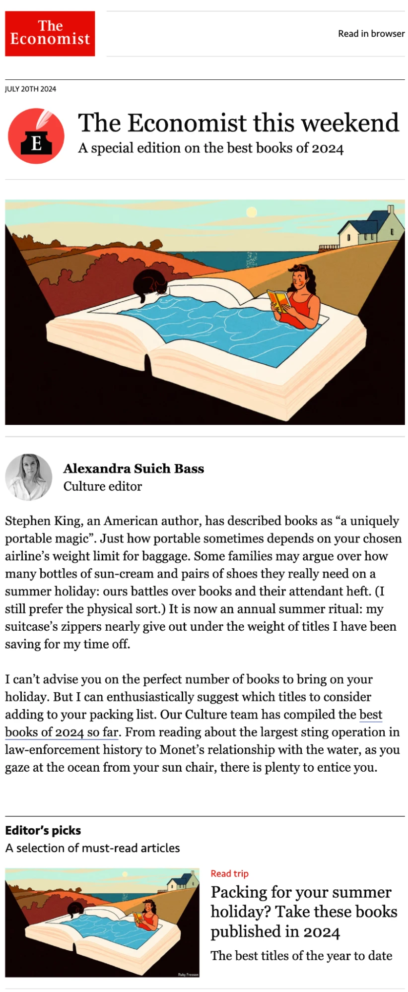 This newsletter from The Economist has several cool design features. It uses consistent colors and fonts throughout. It also has graphics with a unique style that readers will instantly recognize as being that of the publication.