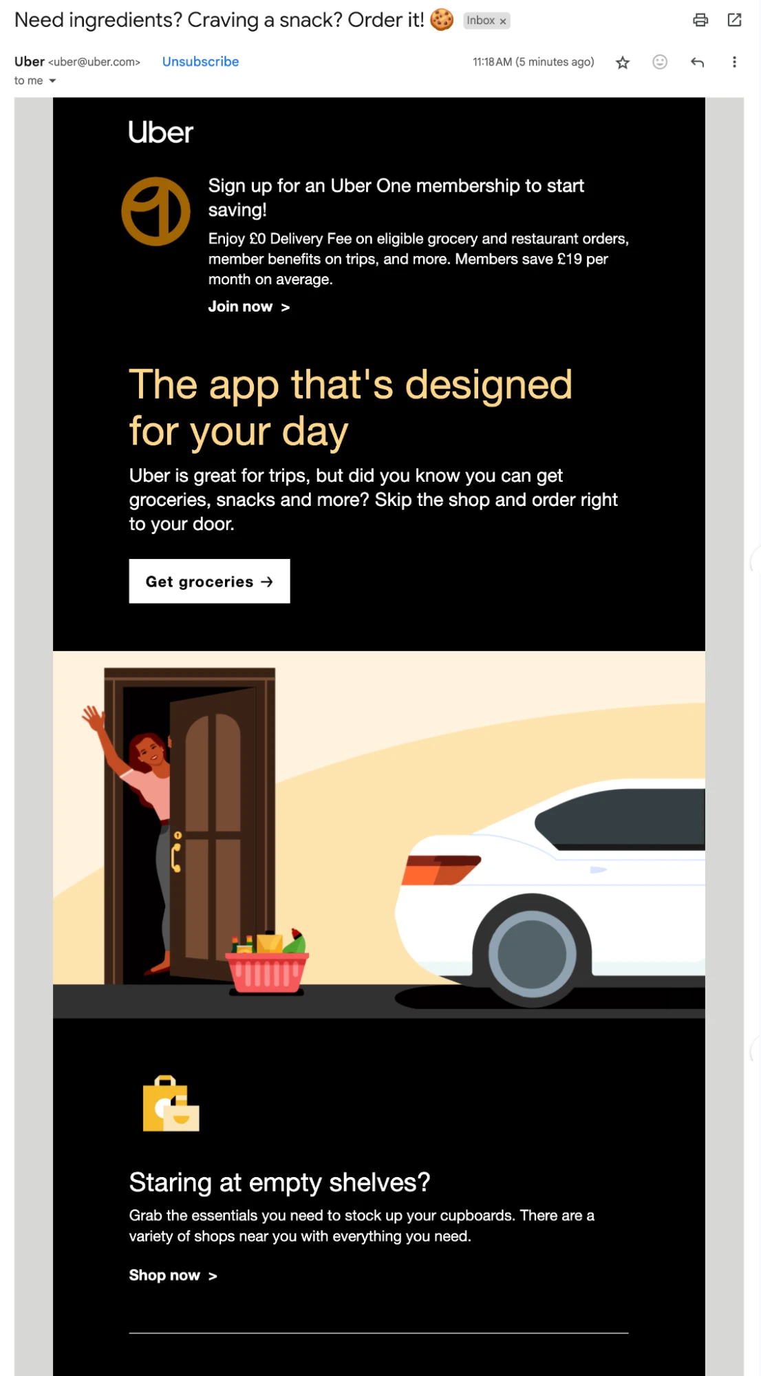 This email from Uber has a distinctive black background with light text that is still easy to read. It breaks up the dark color with a light-colored graphic. Also, check out the subject line. Using an emoji is sure to help the email stand out in crowded inboxes.