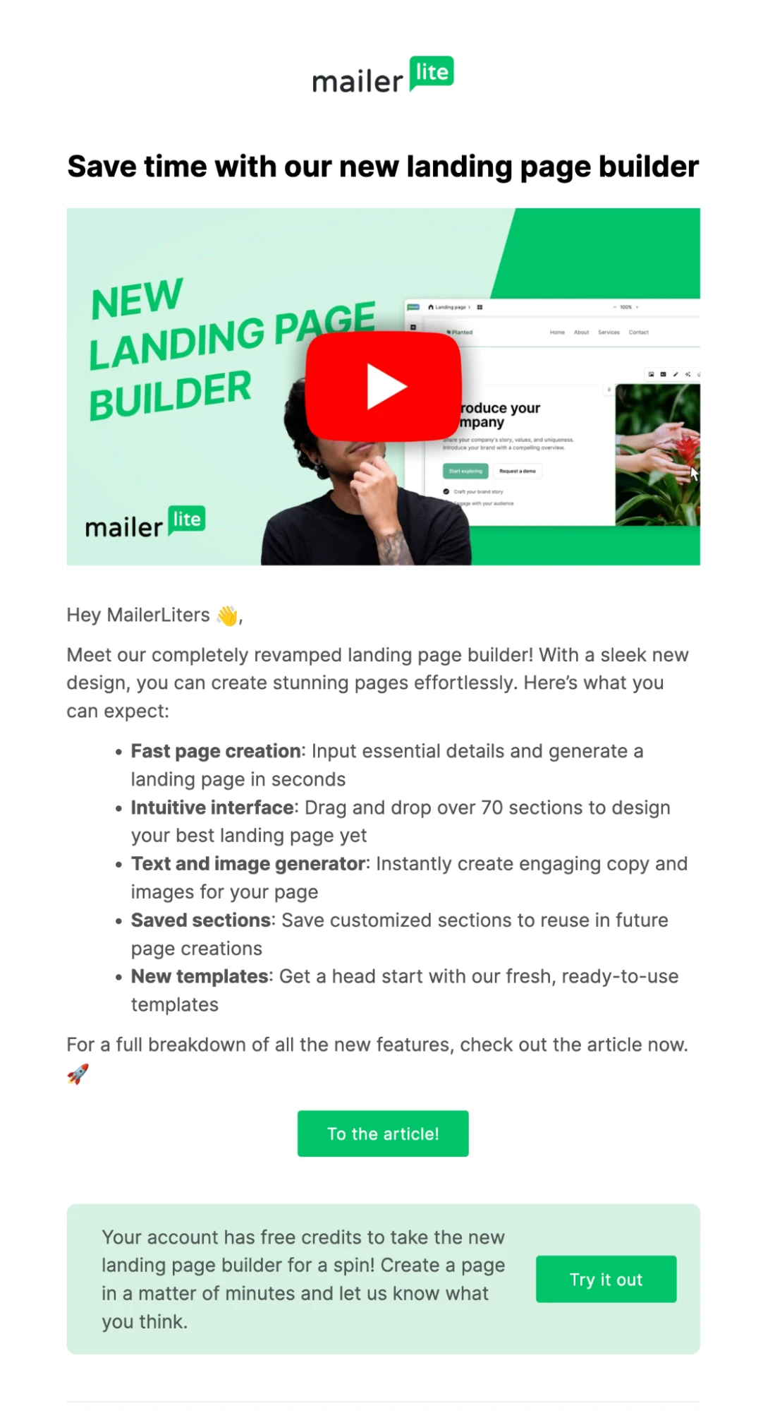 MailerLite’s intuitive email builder, customizable templates, global brand settings, pre-built blocks, and granular customization options are all you need to create beautiful emails that wow your audience. Try it out for free with a 14-day trial.